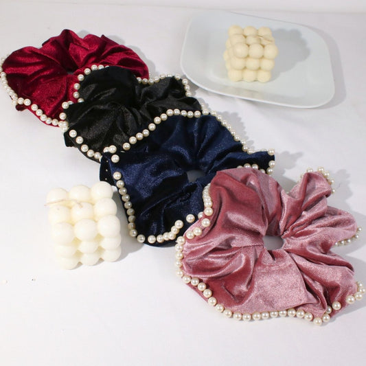 12 Scrunchies de Tela Terciopelo con Perlas de Fantasía