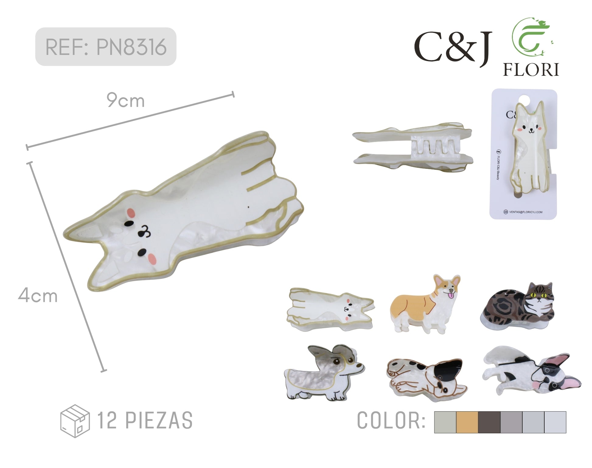 Conjunto de doce pinzas decorativas elaboradas en acrílico de alta calidad, cada una presenta un diseño exclusivo que combina motivos de caninos y felinos. Ideales para organizar y embellecer tu cabello con un toque de personalidad animal. Las pinzas ofrecen un agarre seguro sin dañar el cabello, gracias a su acabado suave y pulido. Perfectas para uso diario o como accesorio de moda versátil. Un pack completo que proporciona variedad de estilos en una sola compra.